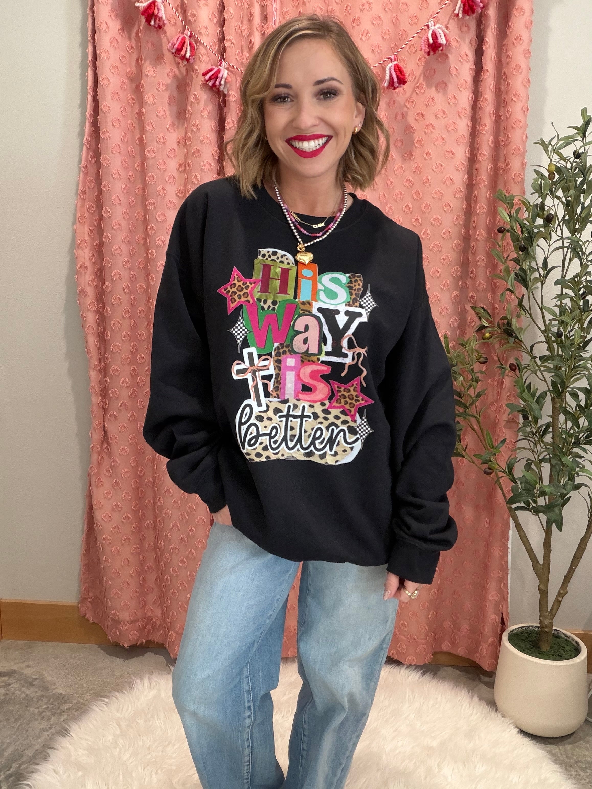 Bold, faith-filled, and full of personality 🤍 The His Way Is Better graphic sweatshirt features a playful mix of fonts, patterns, and textures—think leopard print, stars, bows, and layered lettering—for a statement look that still feels cozy and wearable. Printed on a soft black sweatshirt with a relaxed fit, this one is perfect for everyday layering or lounging in style.