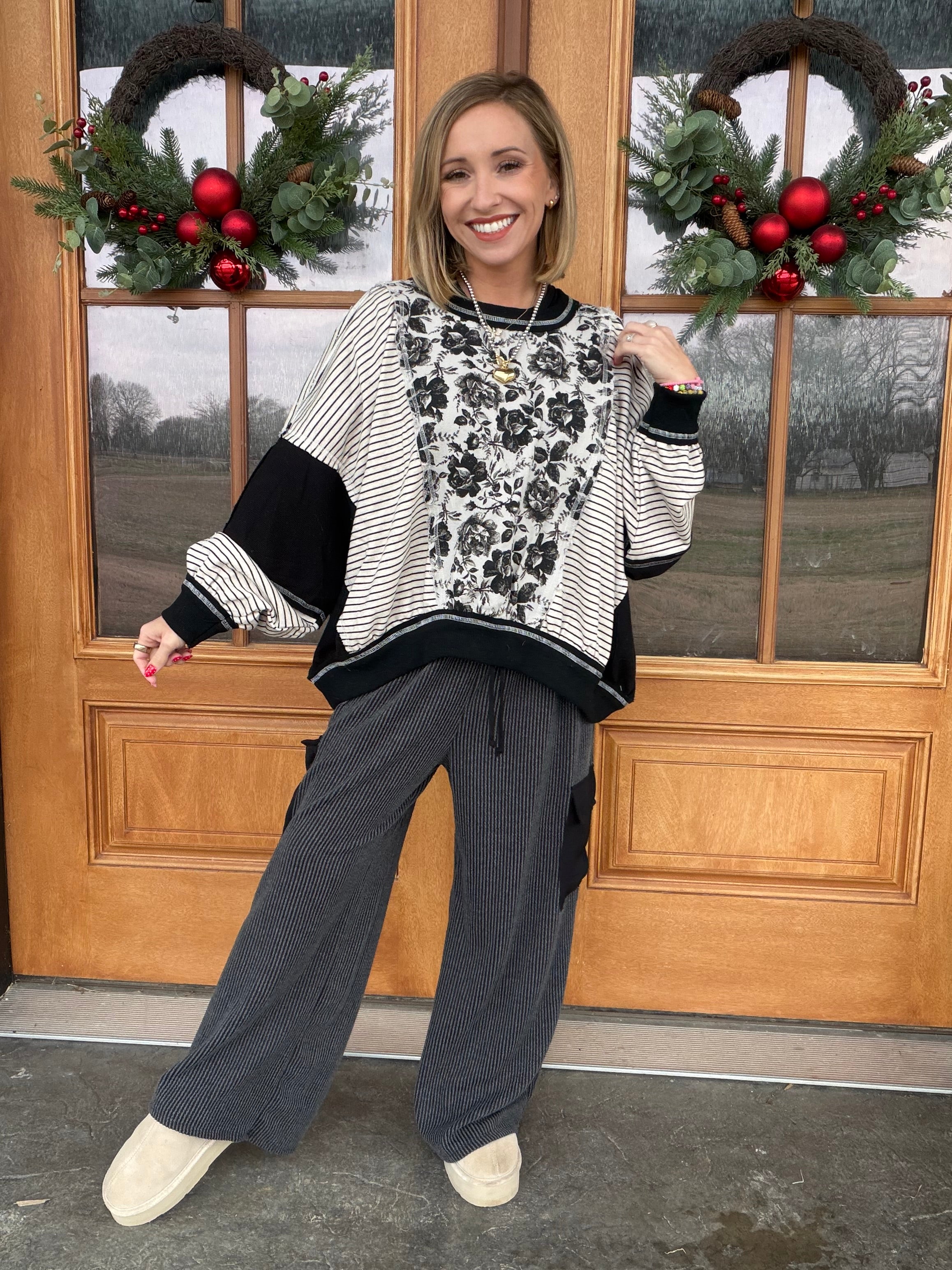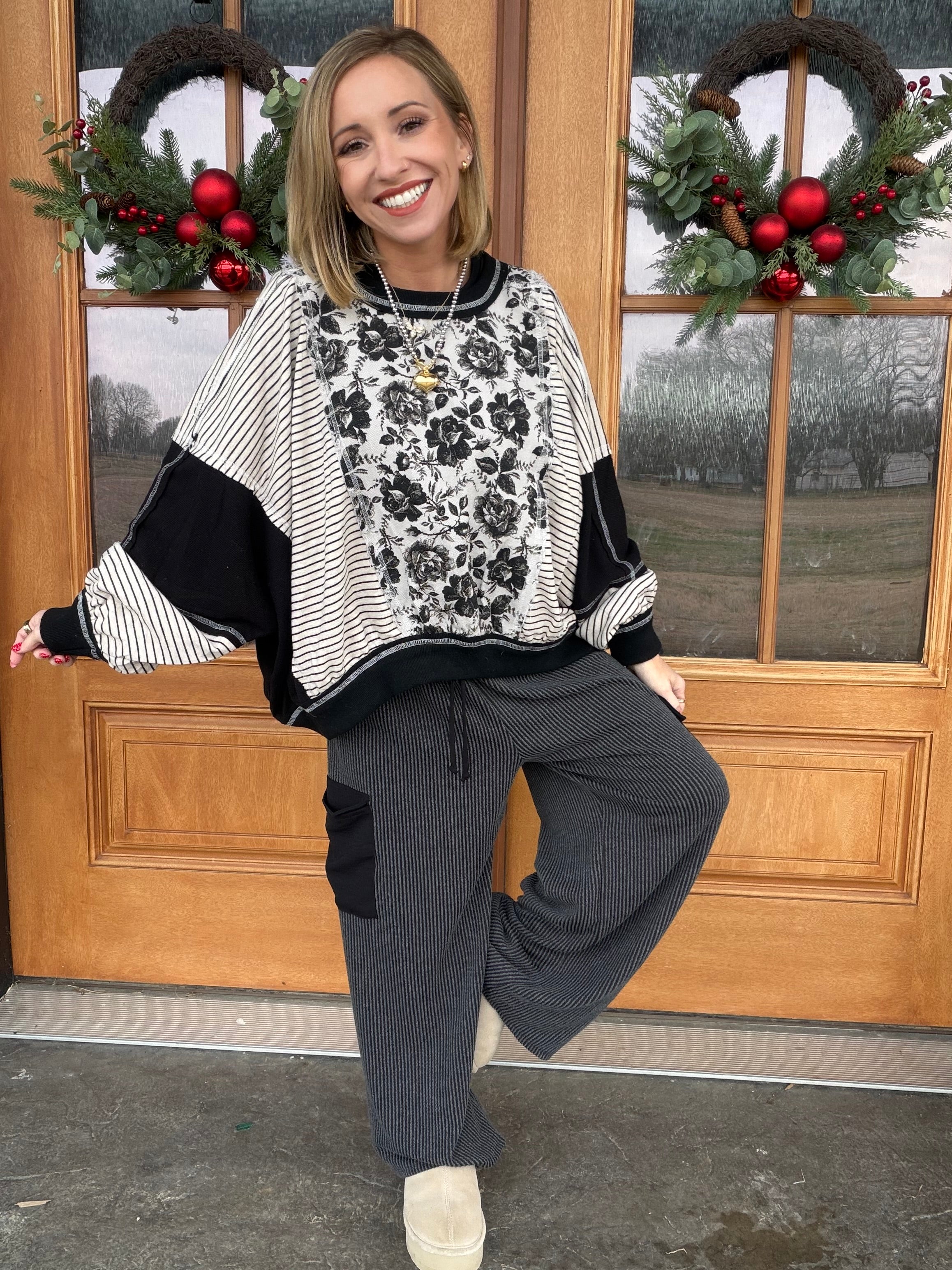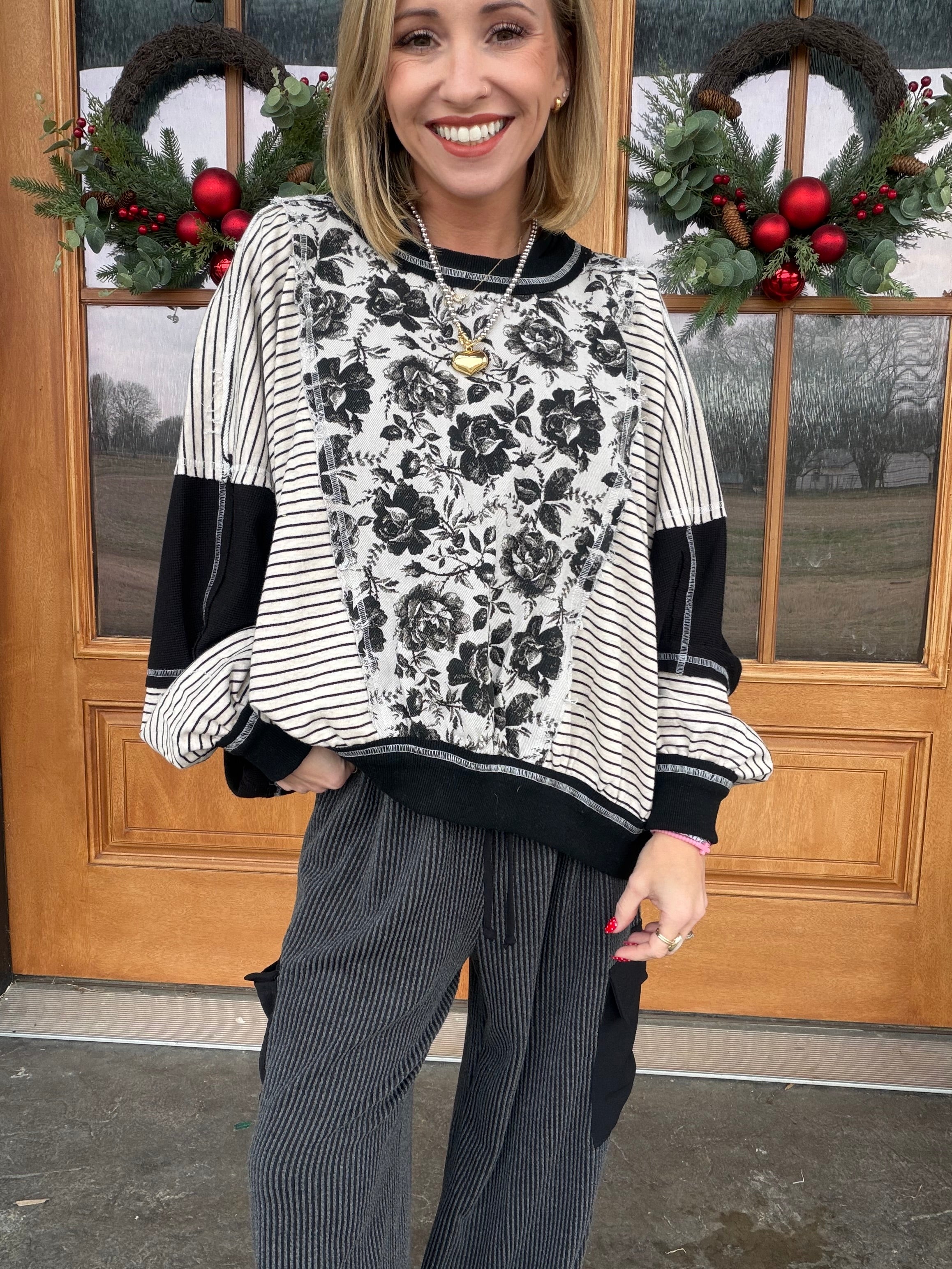 Rose Twill and Stripe Mix and Match Top with Cut Edge Detail