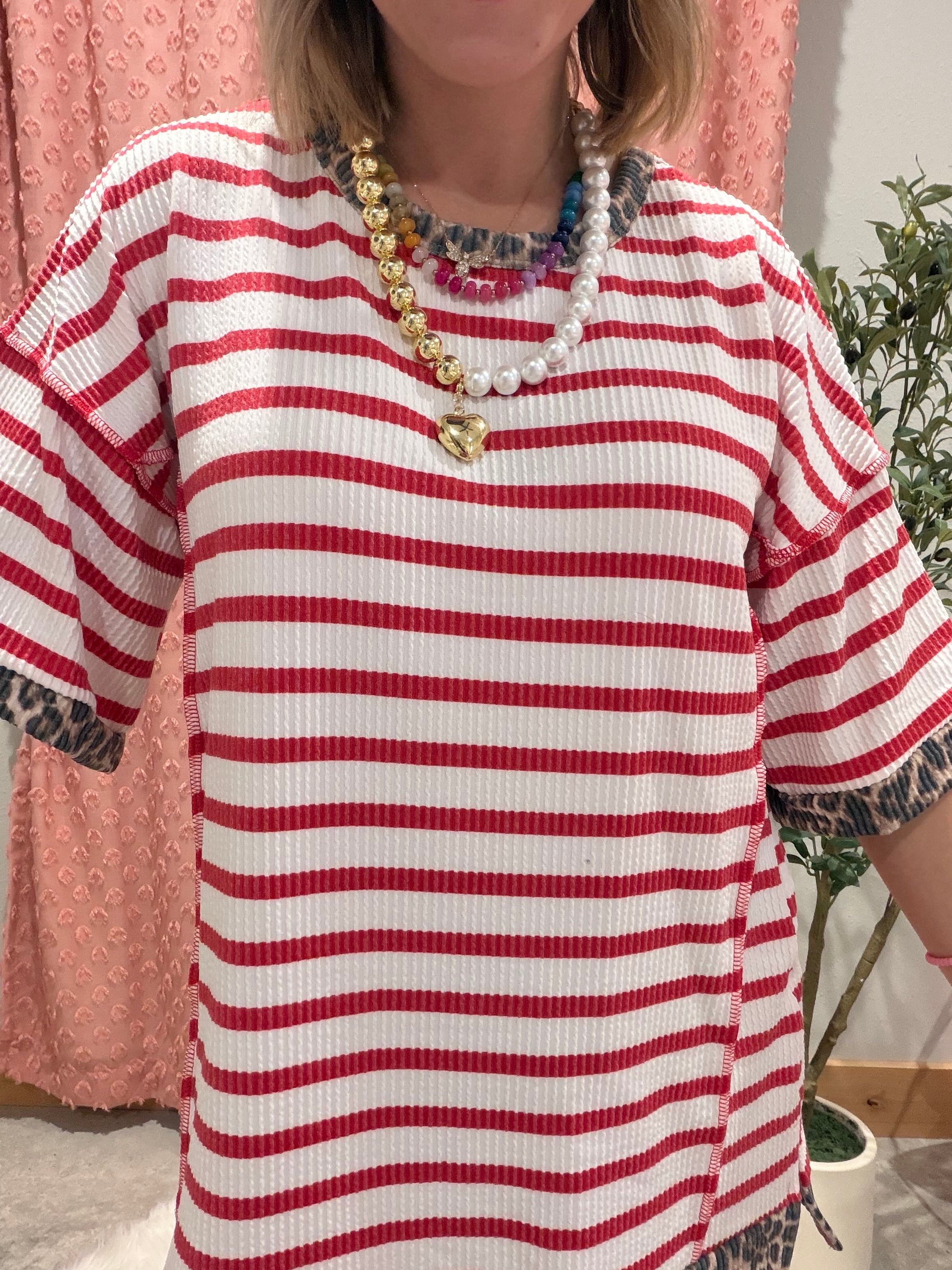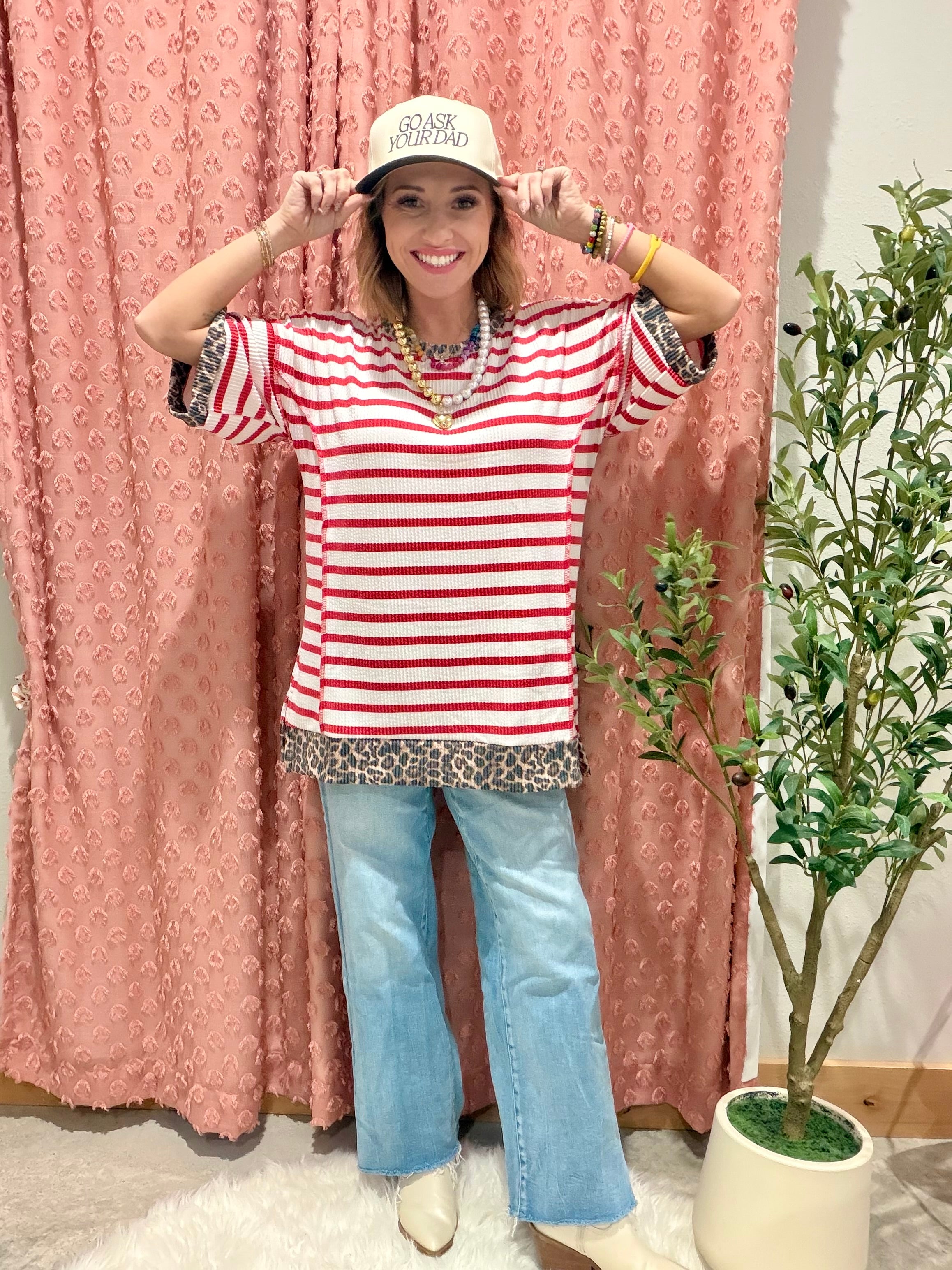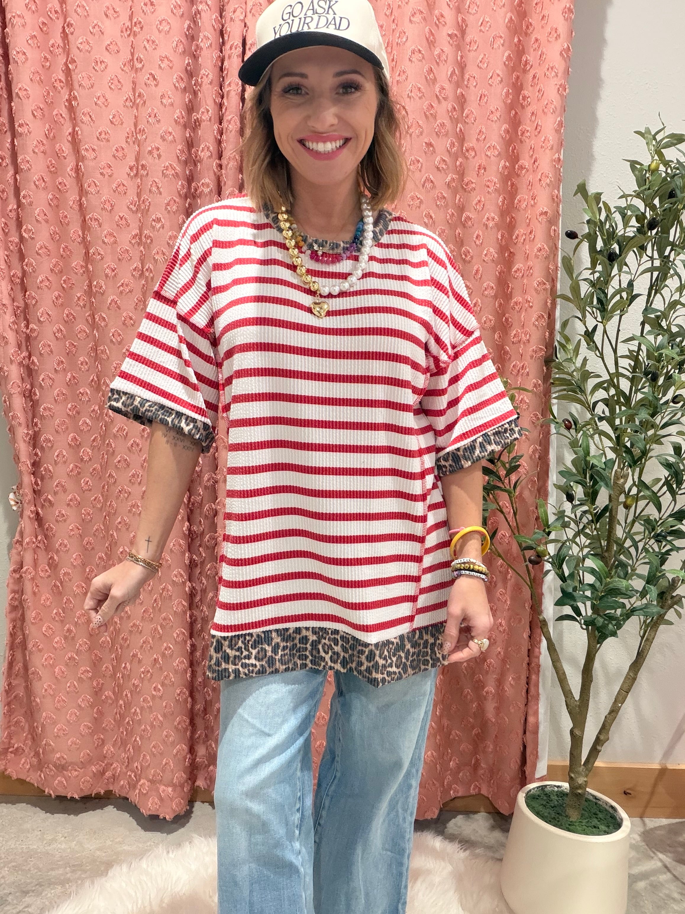 Classic stripes get a bold upgrade in this effortlessly cute everyday top. Featuring red and ivory stripes with leopard print contrast trim at the neckline, sleeves, and hem, this piece blends timeless and trendy in the best way. The relaxed fit and lightweight knit make it an easy grab-and-go option for busy days when you still want to look put together.
