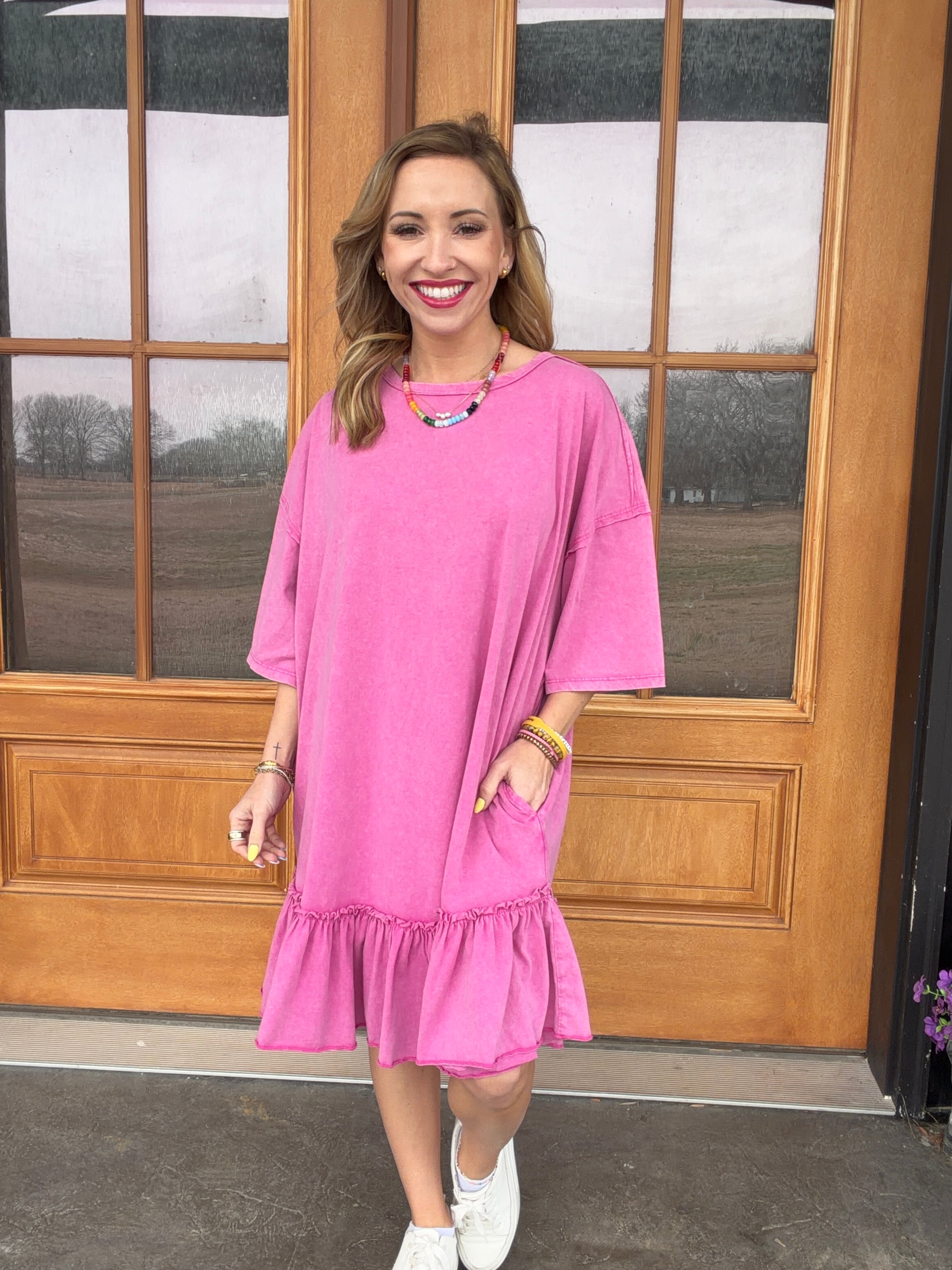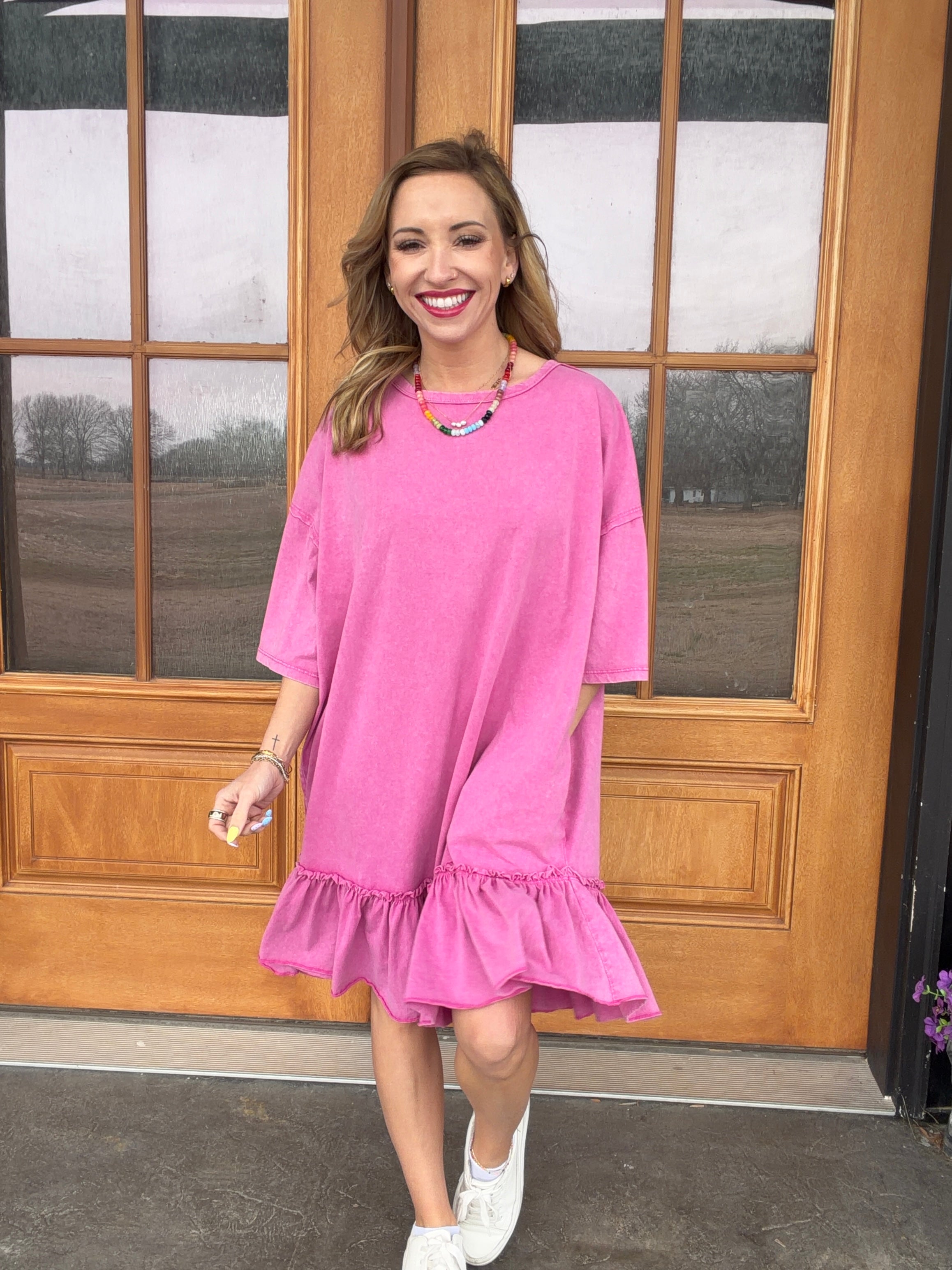 This relaxed-fit beauty features a soft mineral-washed pink fabric with an effortless oversized silhouette and the cutest ruffle hem detail. It’s comfy, flattering, and perfect for days when you want to look put together without even trying.