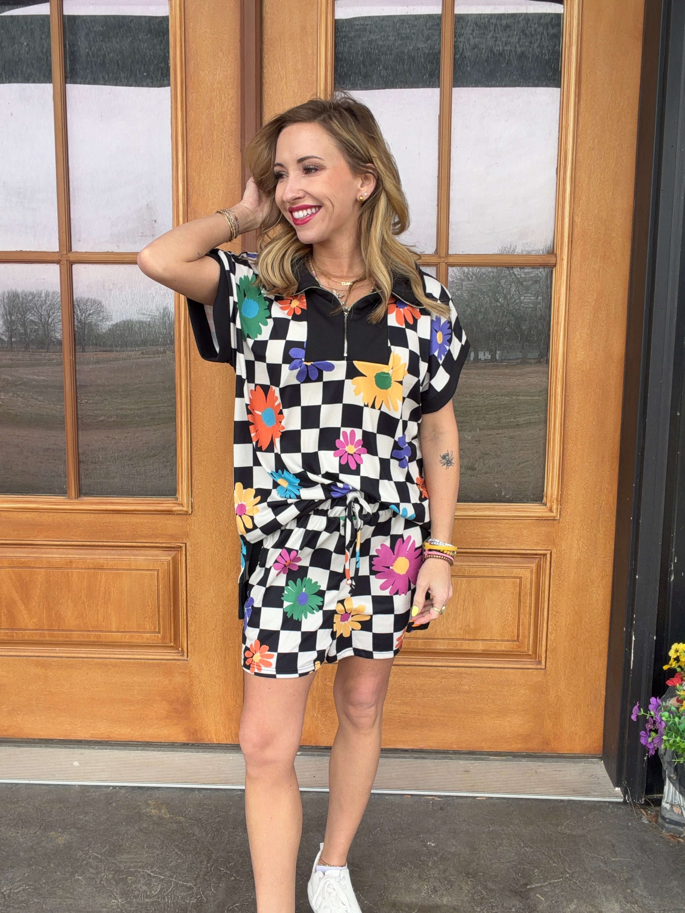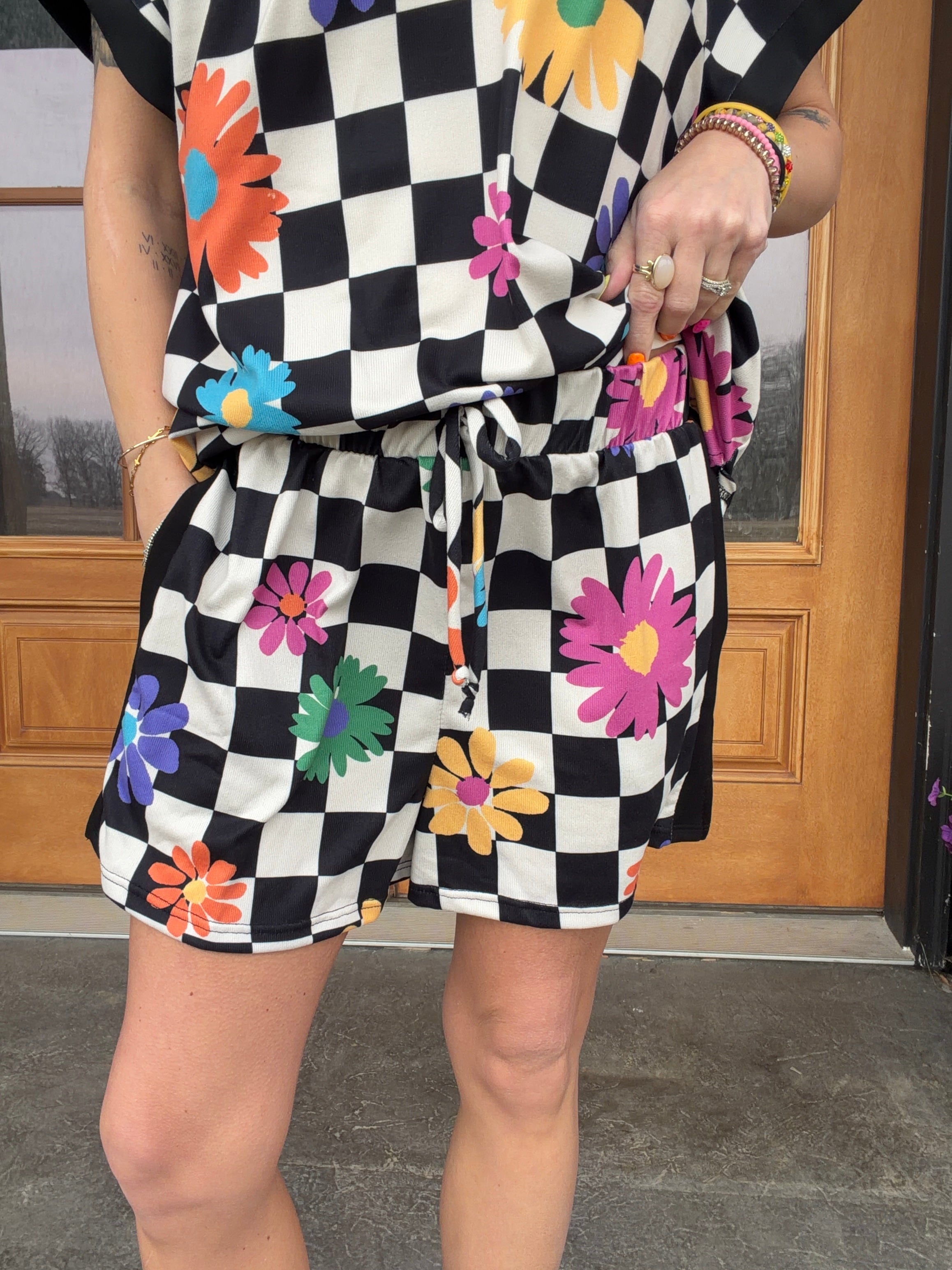 These black and cream checkered shorts feature vibrant multicolor floral prints for the ultimate fun spring + summer vibe. Designed with a comfy elastic waistband and functional drawstring, they’re equal parts statement and everyday wear.