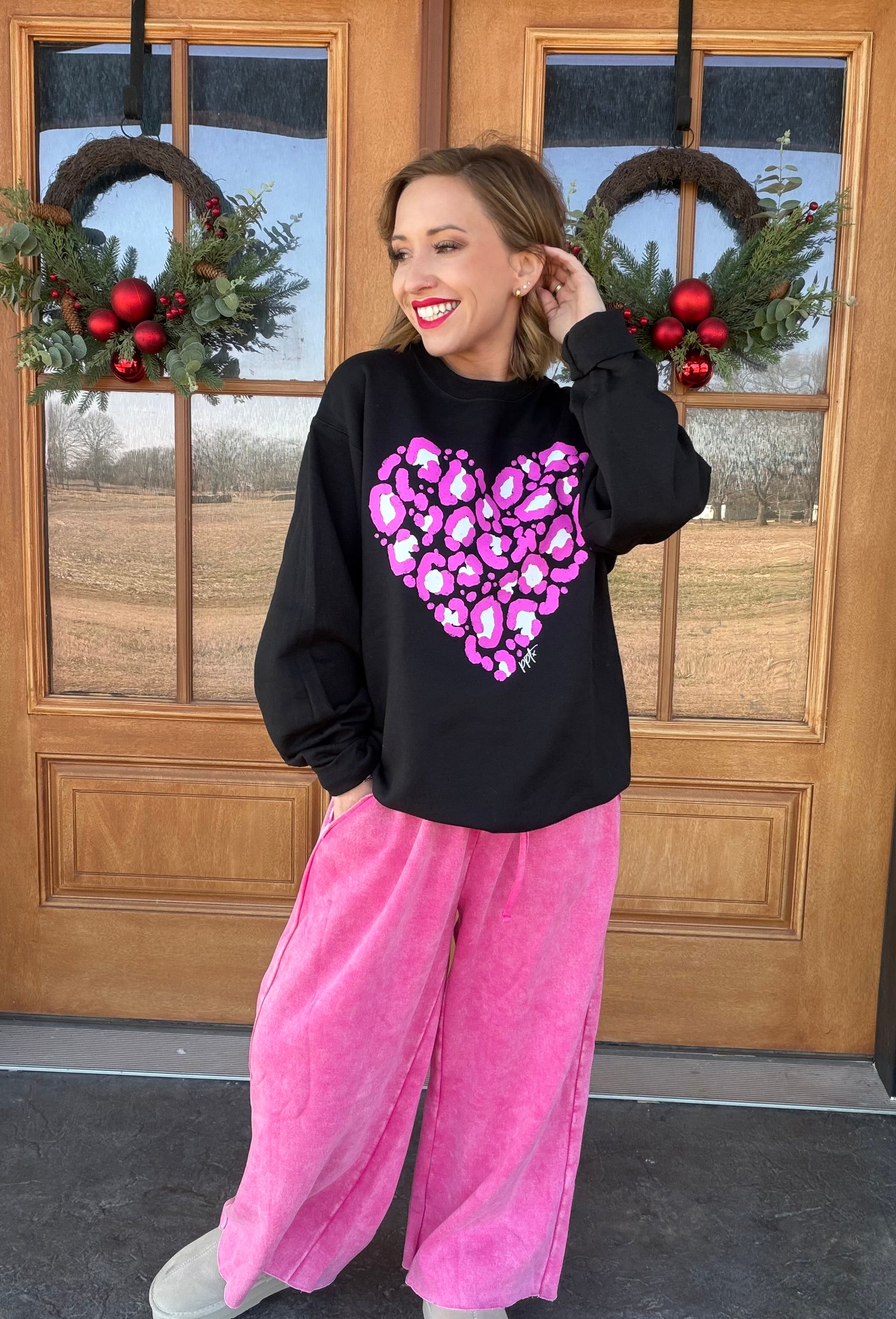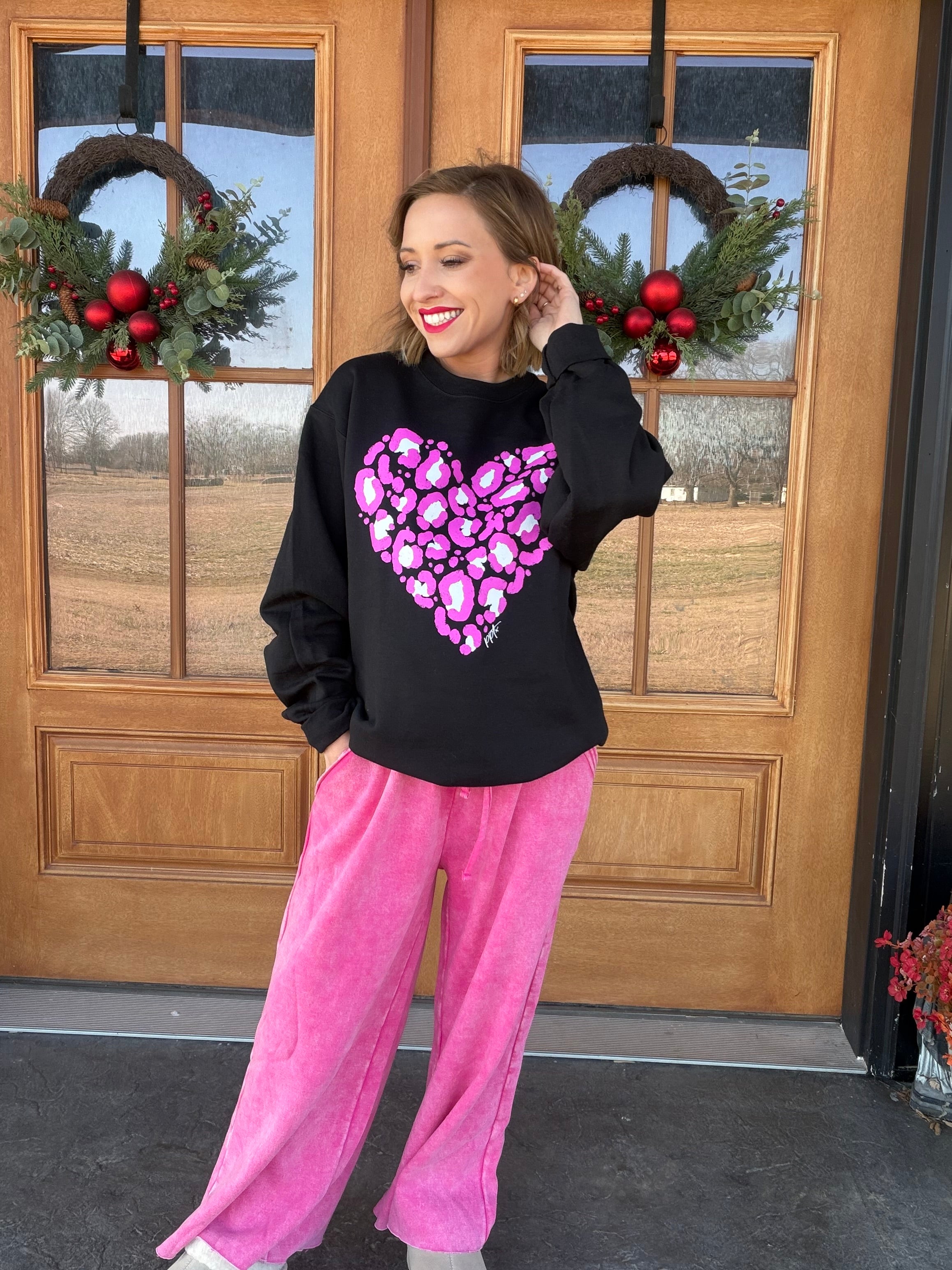 Bold, cozy, and made to stand out 💖 This pink leopard heart crewneck is the perfect mix of playful and comfy. Featuring a statement leopard heart graphic in vibrant pink tones on a classic black base, this sweatshirt brings fun Valentine energy with an everyday feel.