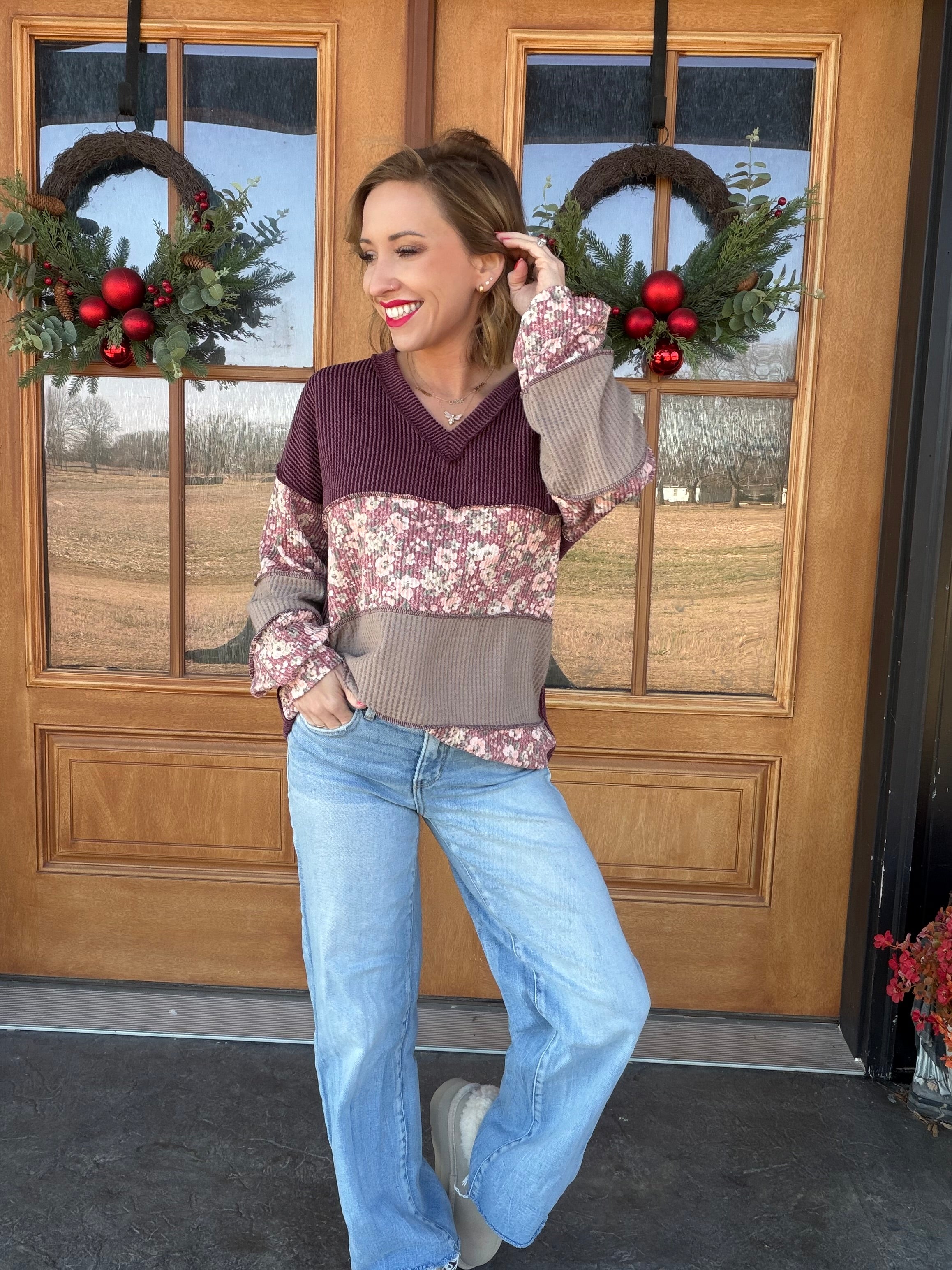 Soft, flattering, and full of charm 🤍 This burgundy floral colorblock top is the perfect mix of cozy comfort and everyday style. Featuring a ribbed knit V-neckline, relaxed fit, and mixed textures throughout, this top gives you an effortlessly put-together look with a touch of feminine detail.