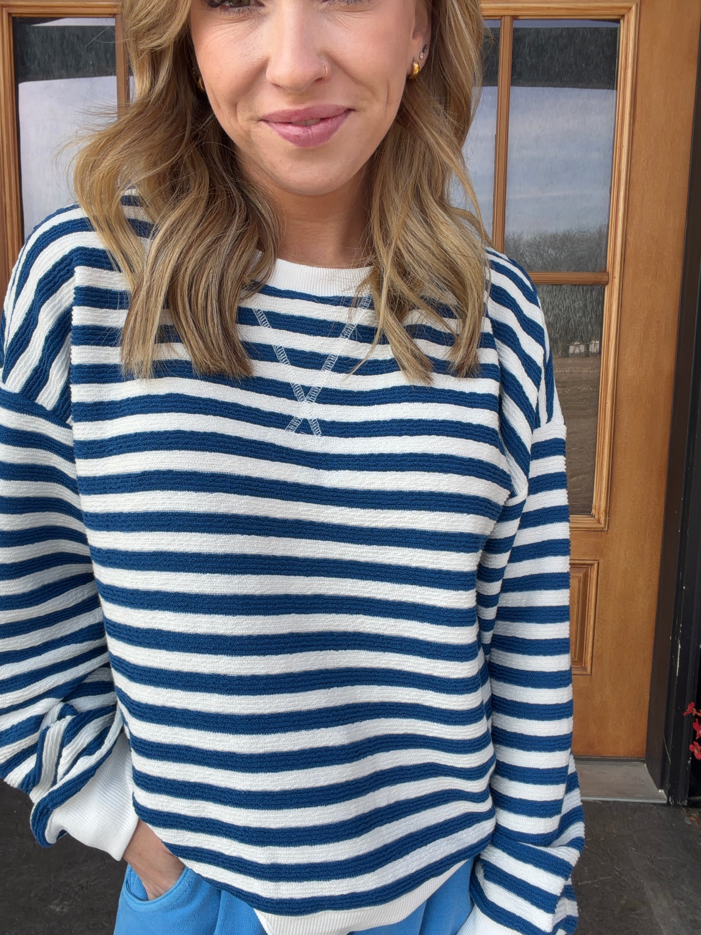 Meet your new everyday favorite. This navy + ivory striped pullover delivers effortless style with cozy comfort — perfect for errands, travel days, or laid-back weekends.