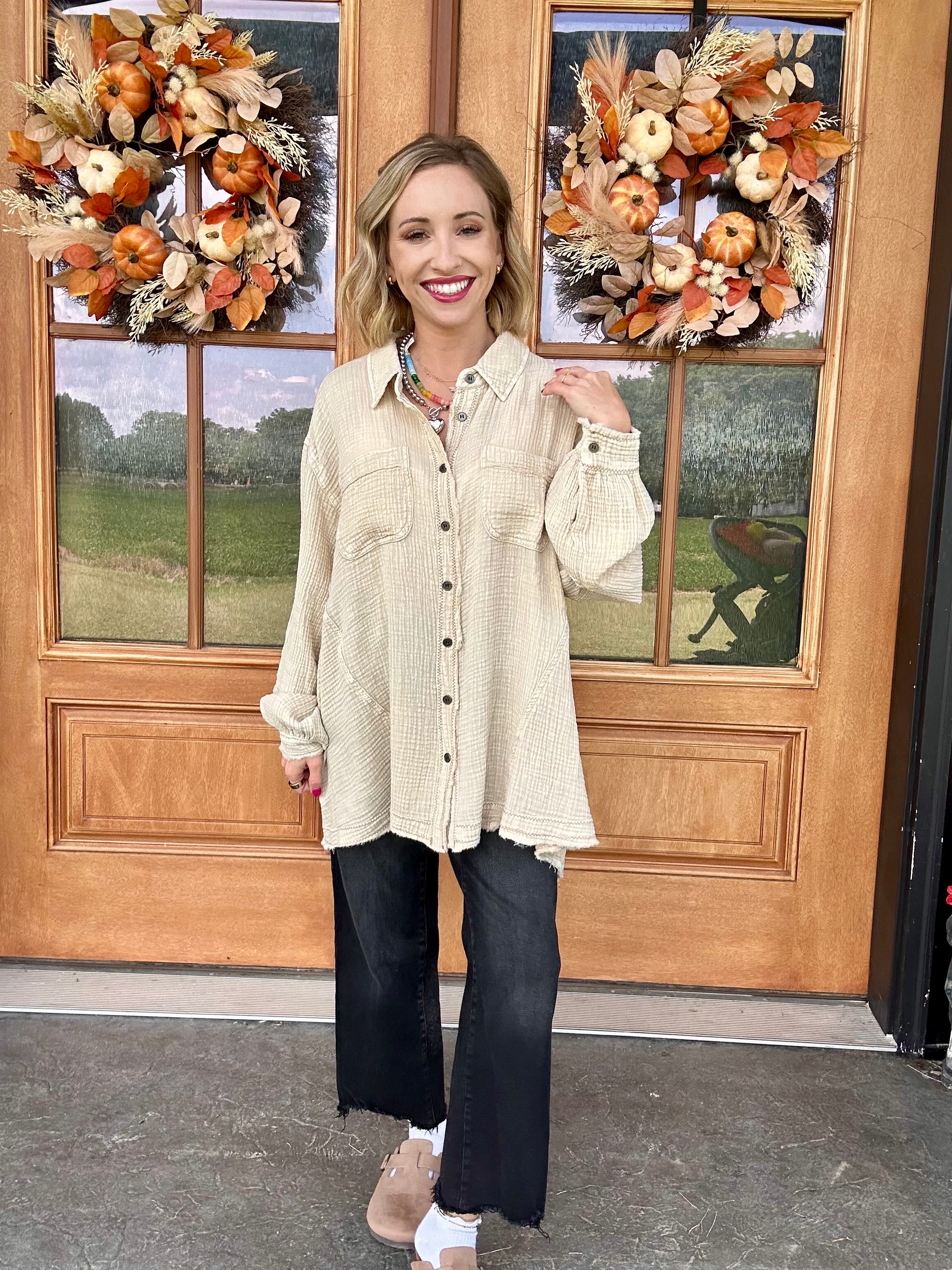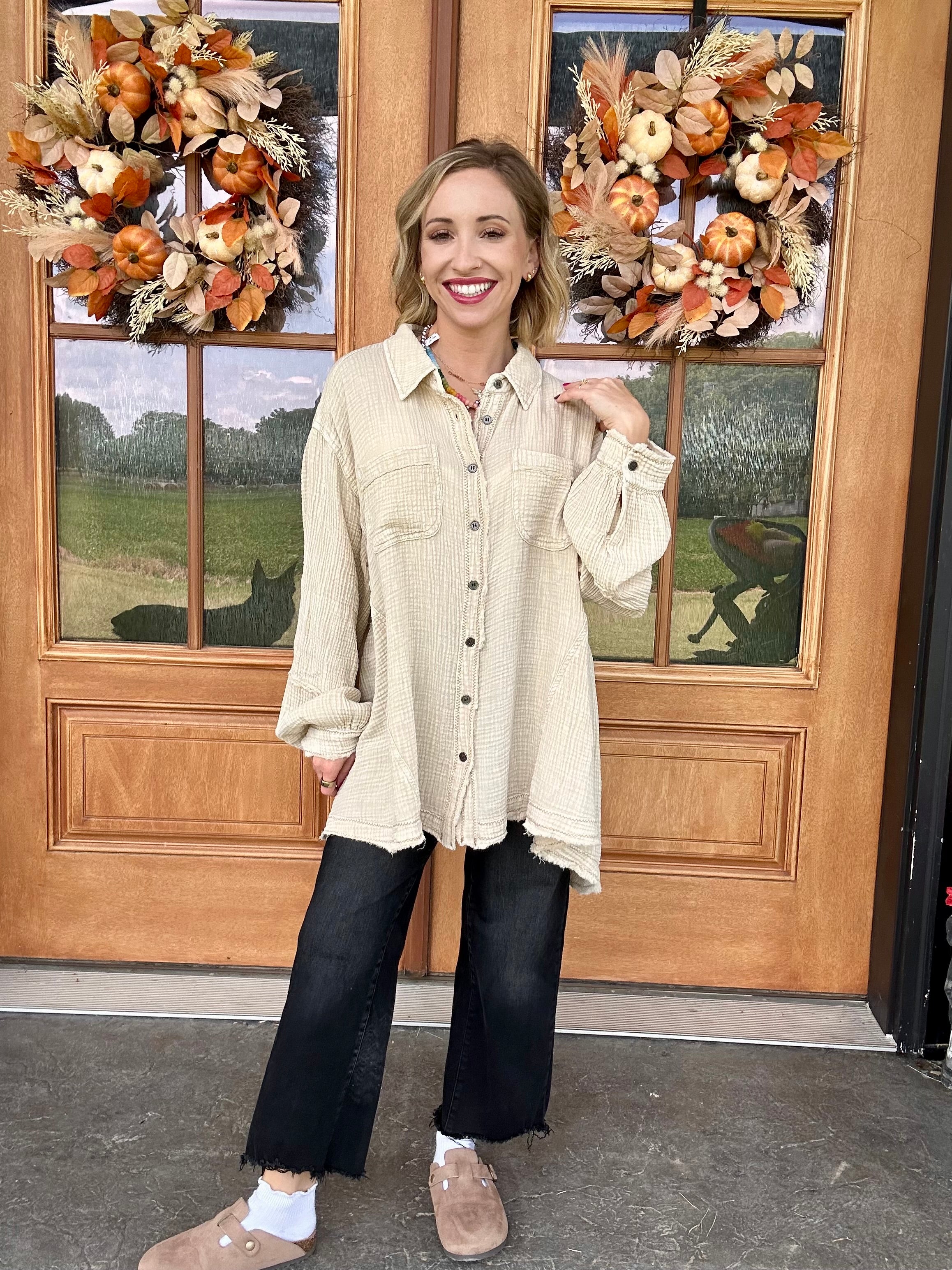 LS BUTTON DOWN COTTON GAUZE MINERAL WASHED BABYDOLL SHIRT