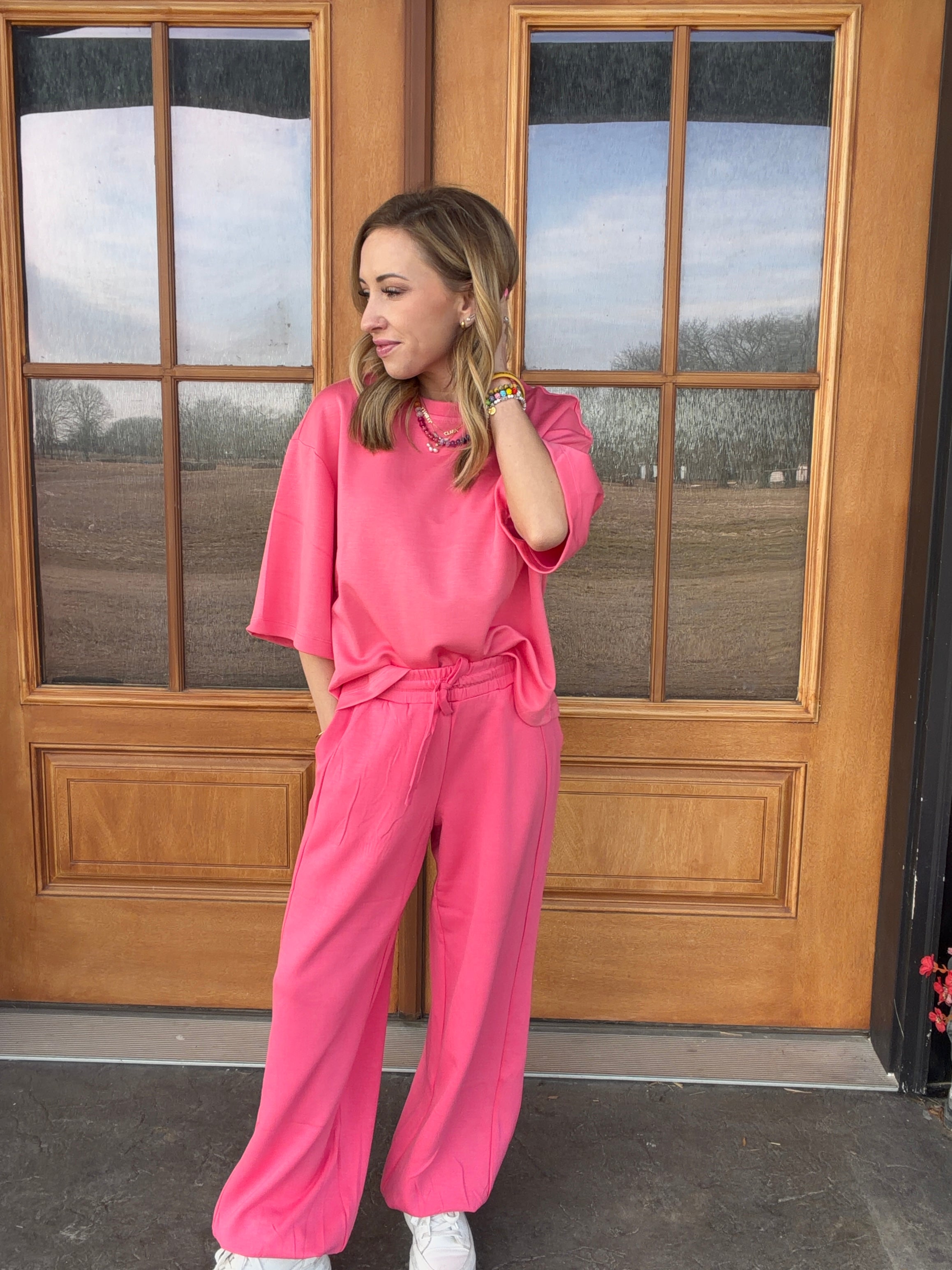 Made with a lightweight, soft fabric that drapes beautifully, this set features an oversized short-sleeve top paired with relaxed, drawstring wide-leg pants for an effortlessly elevated look. It’s comfy enough to lounge in, but polished enough to wear out the door.