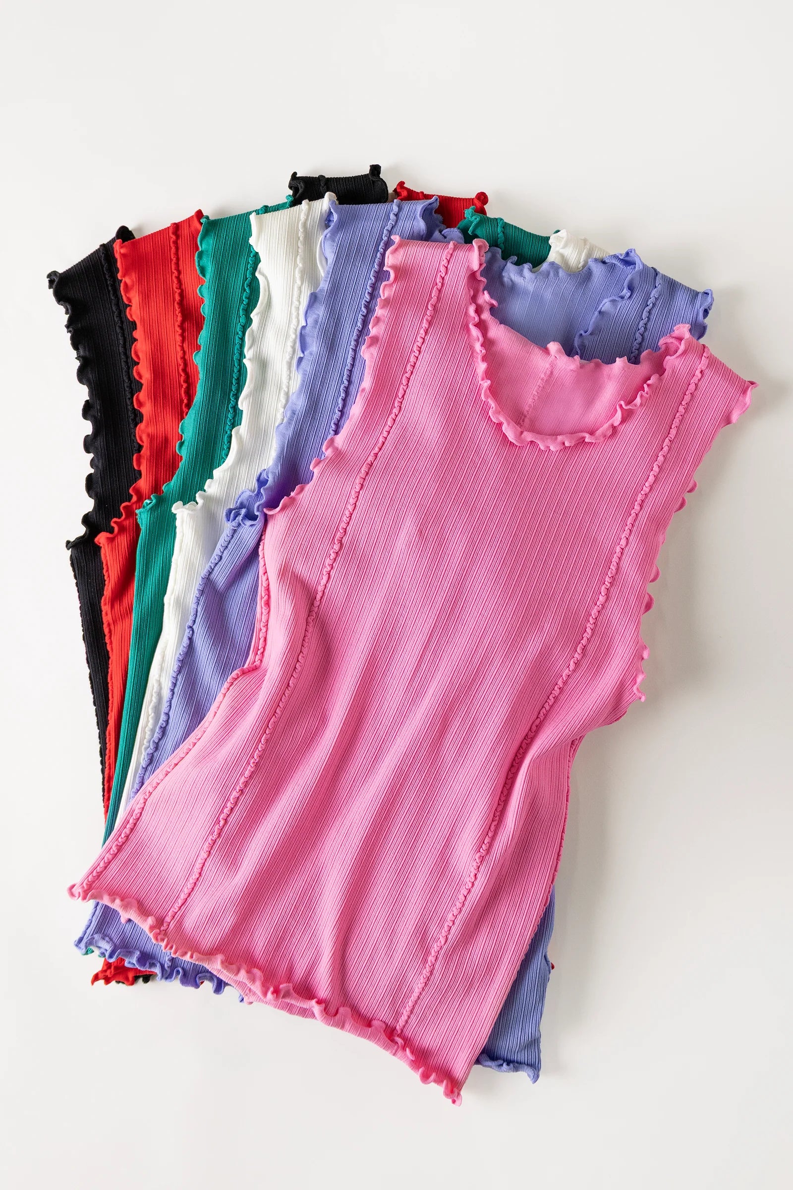 This fitted knit tank features a classic round neckline with subtle lettuce hem detailing for a feminine touch. Made from a super soft, ultra-stretchy fabric, it hugs just right while staying comfortable all day long.