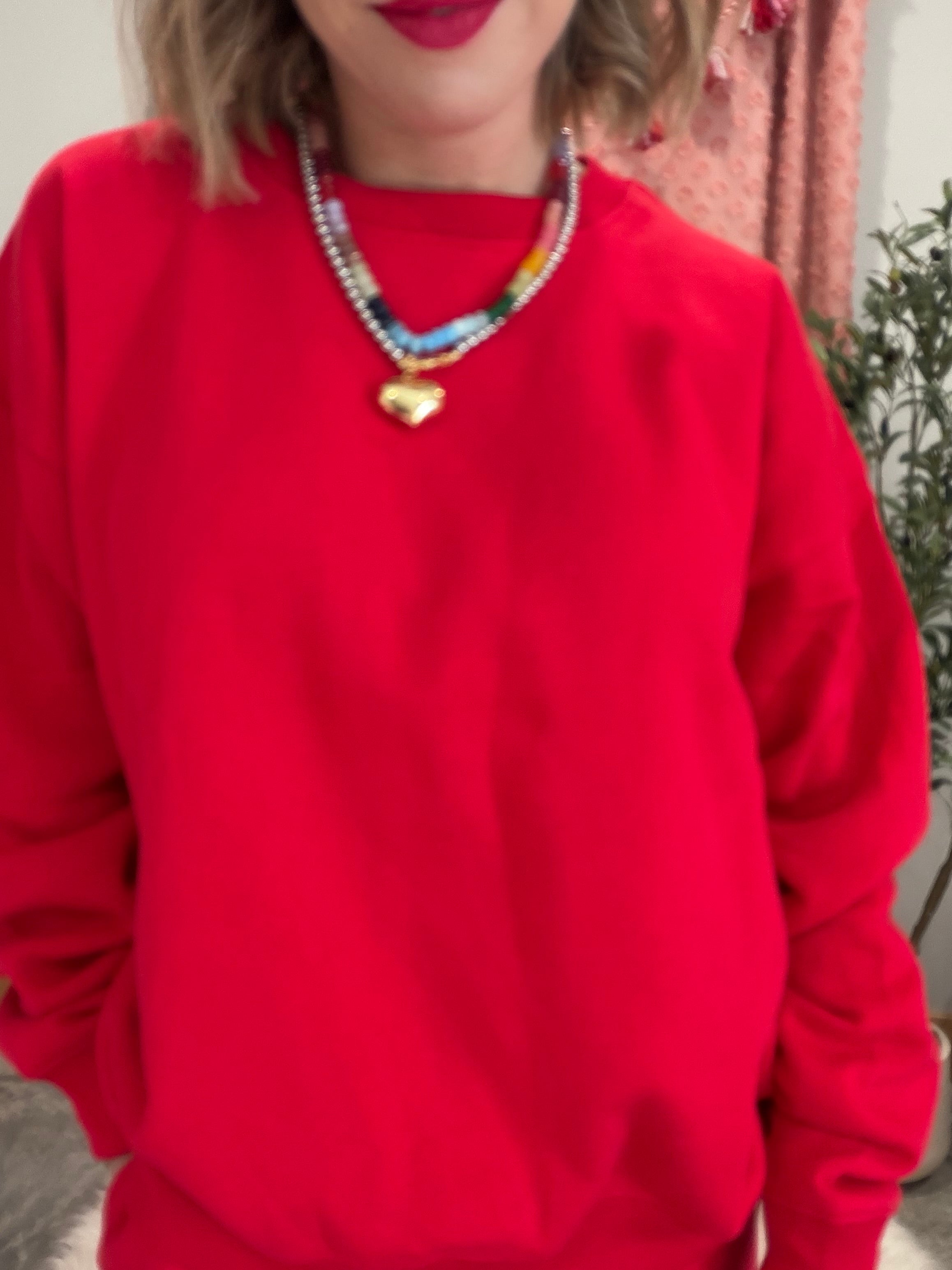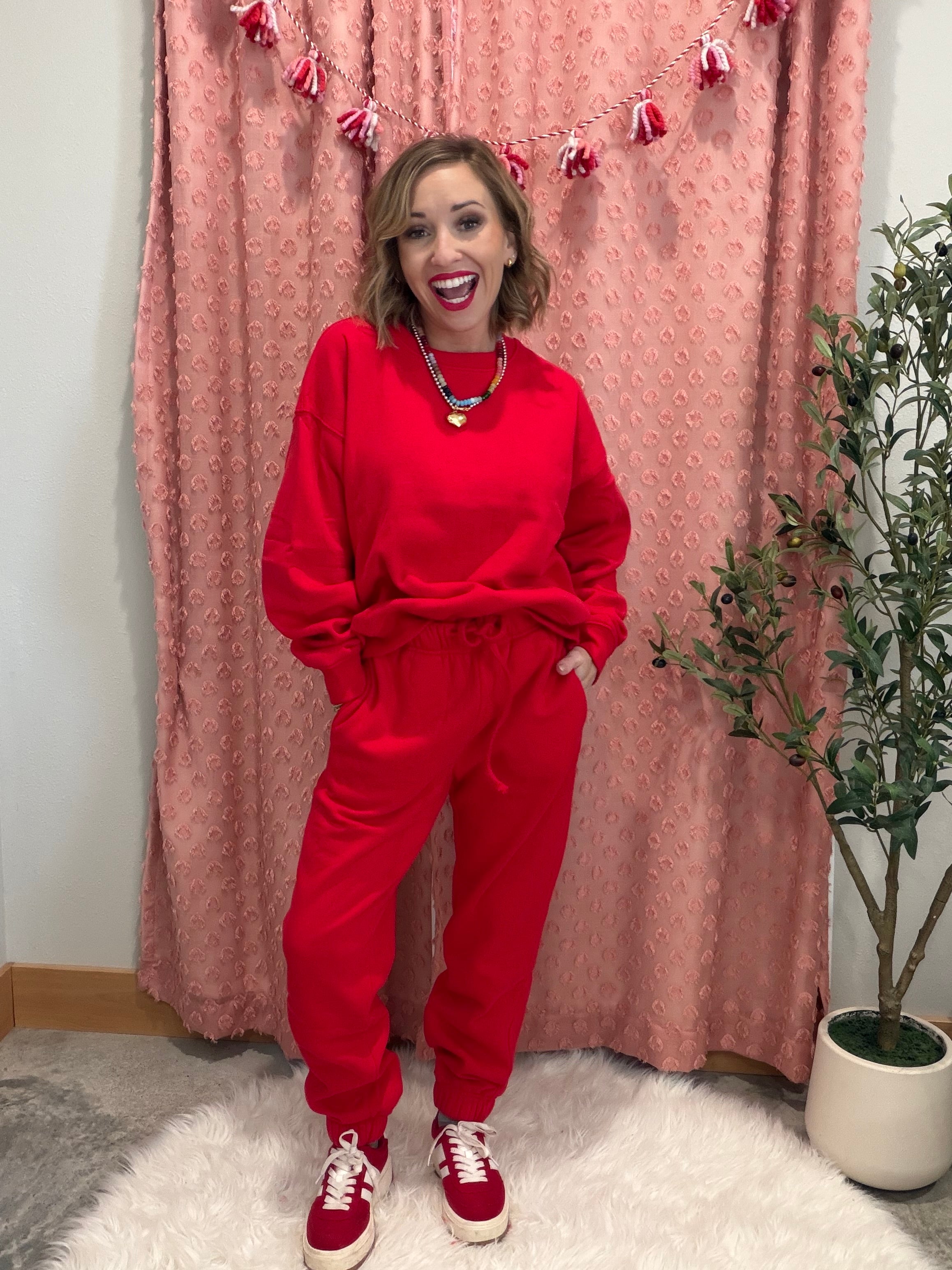 Comfort, but make it cute 😍 This bold red sweat set is your new go-to for laid-back days when you still want to look put together. Featuring a relaxed-fit sweatshirt and matching joggers, this set is soft, cozy, and effortlessly stylish. Wear it together for an easy statement look or mix and match with your favorite denim or leggings.