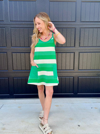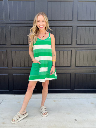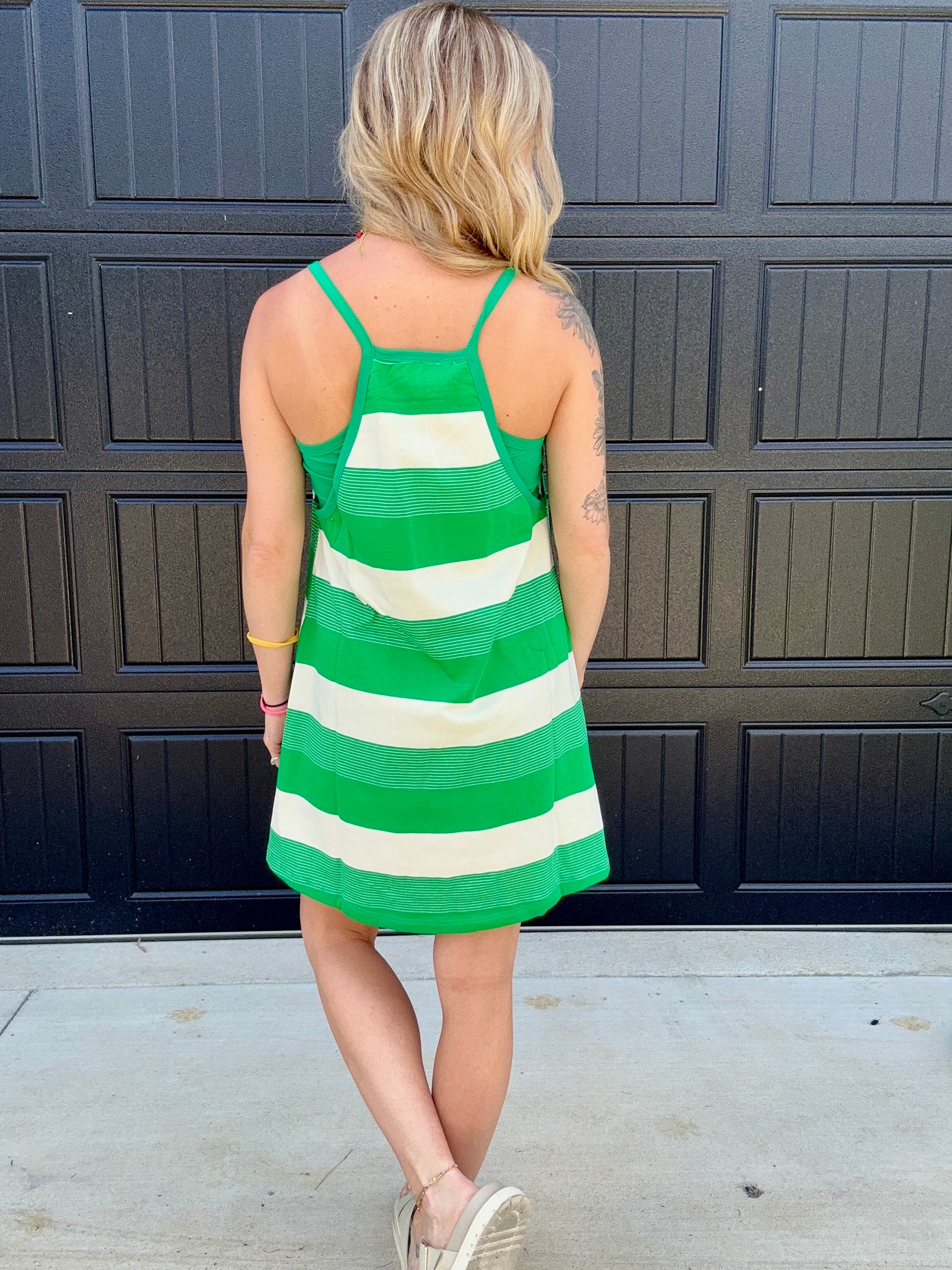 V-Neck Stripe Mini Dress with Built in Romper with Shorts Lining!!