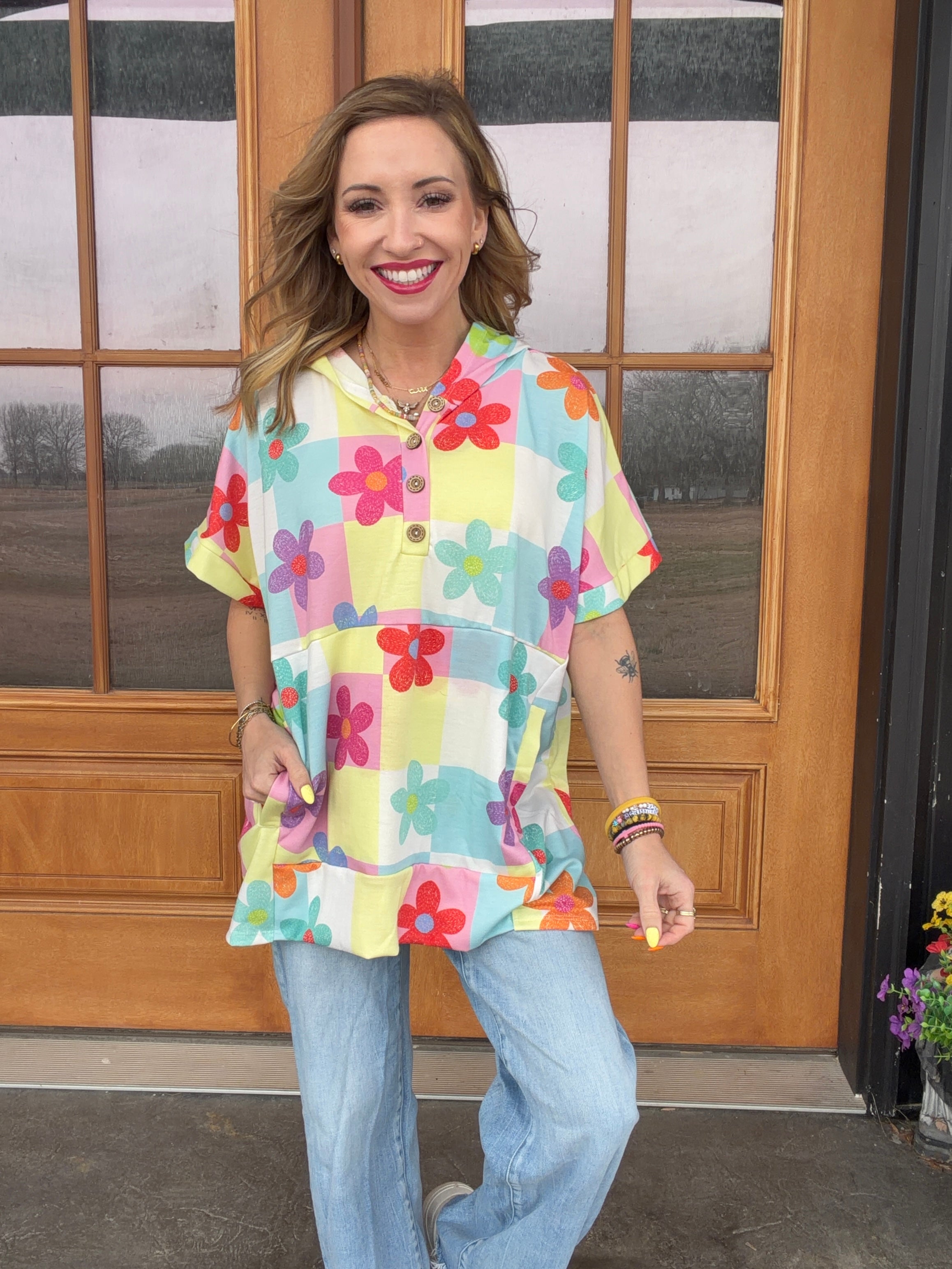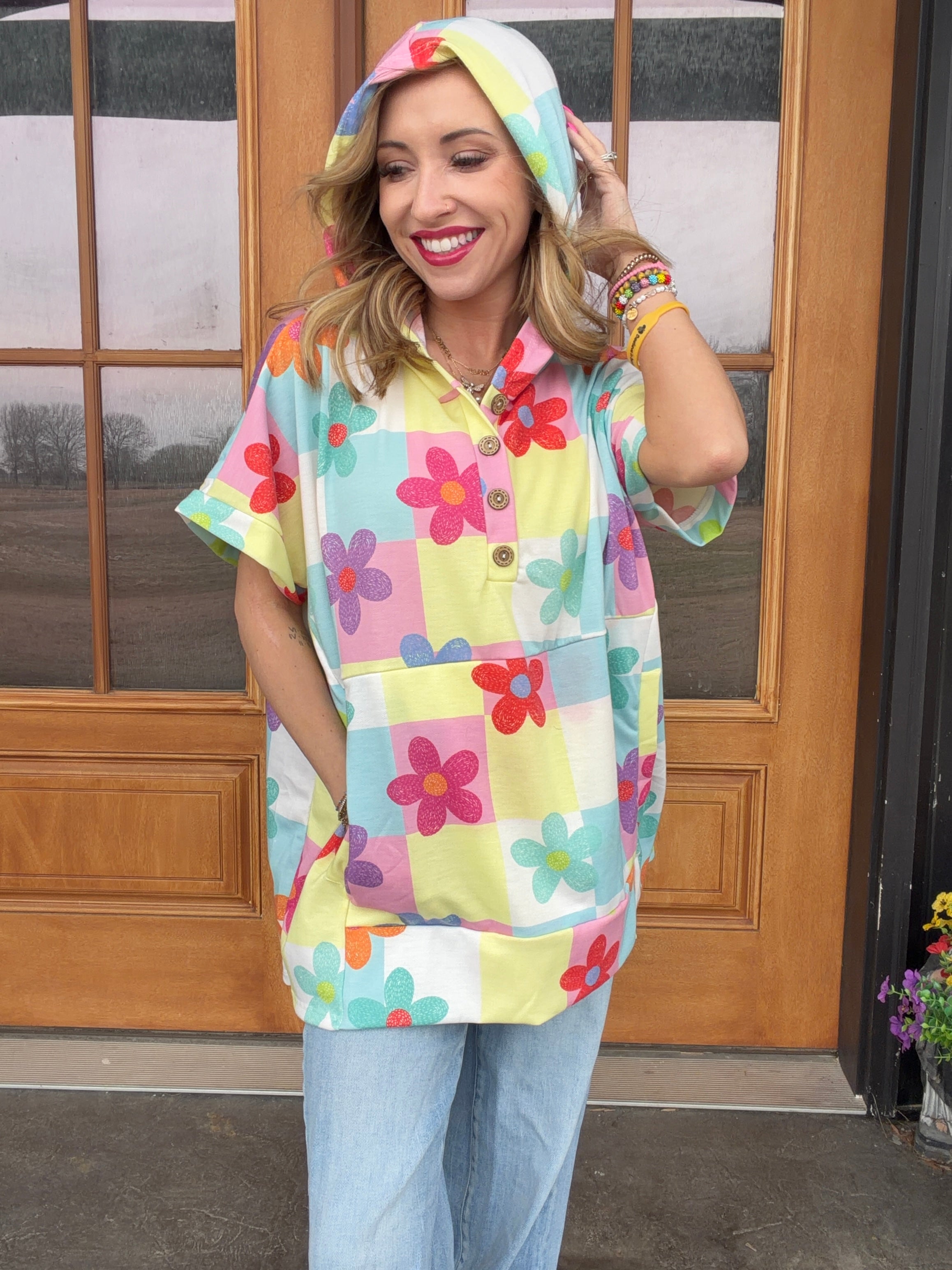 Say hello to your new feel-good favorite! This colorful patchwork hoodie top brings all the spring vibes with its playful floral print and ultra-comfy fit. Designed with a relaxed silhouette, button neckline, and short sleeves, it’s the perfect throw-on-and-go piece for everyday life.